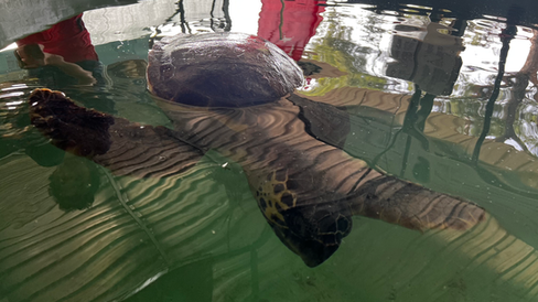 We met lovely Lenad, who was being treated for buoyancy disorder after thinking a plastic bag in the ocean was a jellyfish; she is now unable to dive, and they need to protect her shell. She is floating due to air in her belly, and she will take a few years to heal and be released!!